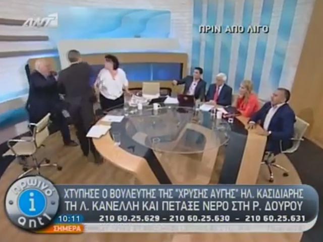 Но когда депутат парламента от коммунистов Лиана Канелли, по всей видимости, кинула в него газетой, Касидиарис разозлился не на шутку и в ответ нанес женщине несколько ударов. После этого он спешно покинул студию.