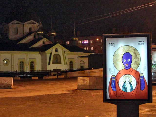 Как сообщалось, в марте на рекламных стойках в некоторых районах Новосибирска появилось изображение женщины в красном плаще и фиолетовой накидке, с поднятыми руками, младенцем на груди и надписью: "СВБД ПСРТ" (свободу Pussy Riot).