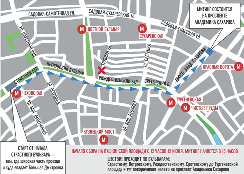 В День России, 12 июня, оппозиция пройдет санкционированным маршем по столичным бульварам. Сбор в 12 часов дня у начала Страстного бульвара. Маршрут: Страстной бульвар, Петровский, через Трубную площадь (полиция ее обещала перекрыть), дальше Рождественский и Сретенский бульвары. Потом вниз до Тургеневской площади и налево на проспект Академика Сахарова (часть проспекта, которая примыкает к бульварам). Здесь в 15.00 начнется митинг. Сцена будет стоять спиной к Садовому кольцу.