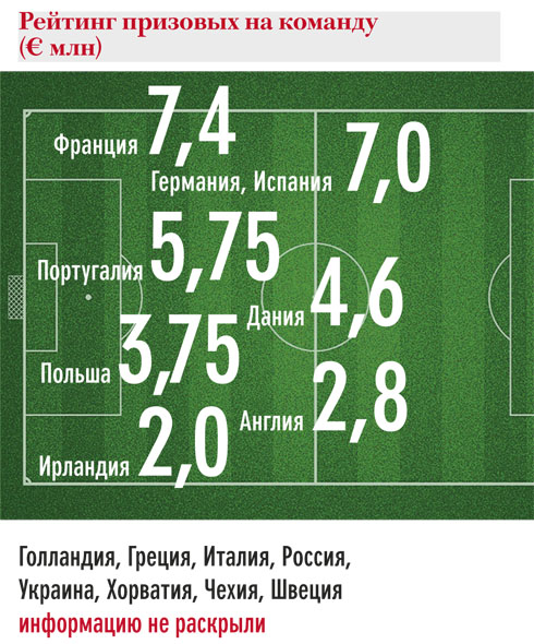 С крупной победы над Чехией начала свой турнирный путь на чемпионате Европы по футболу сборная России. Пока до подведения спортивных итогов первенства далеко, в фокусе внимания оказались финансовые вопросы. А именно — какие премиальные каждая из национальных федераций выплатит своим сборным. Ровно половина из 16 участвующих в Евро-2012 команд решила не раскрывать размер призовых, в том числе Россия. По утечкам из стана сборной, за победу на групповом турнире наша команда получит €800 тыс., за ничью — €400 тыс., за выход в четвертьфинал — бонус €1 млн. Если же удастся пройти дальше — в полуфинал и финал, суммы будут обговариваться дополнительно. Премиальные будут делиться поровну между всеми 23 футболистами, попавшими в заявку на турнир, независимо от того, играли они или находились на скамейке запасных.