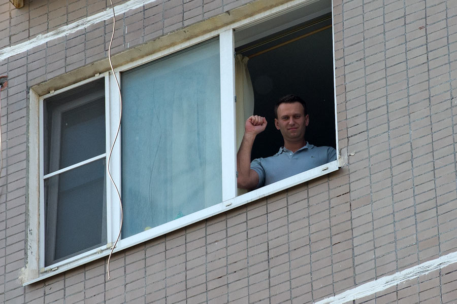 18:30 drugoi: Алексей Навальный в окне своей квартиры на ул. Люблинская. Обыск продолжается уже около девяти часов.