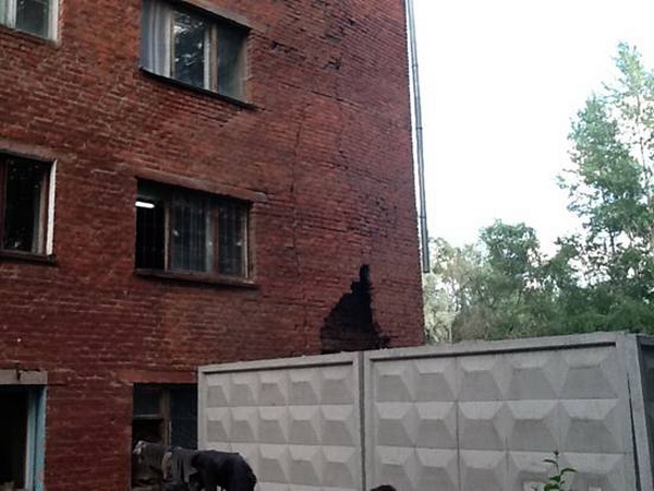 Снаружи видно, что общежитие вот-вот развалится. Не должно быть видно, и власти решают проблему очень просто. Накануне 9 мая они окружают провал в стене бетонным забором:
