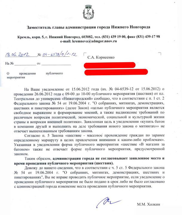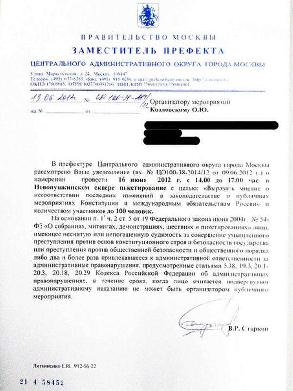 14 июня префектура ответила активистам отказом, указав в качестве причины именно их прошлые правонарушения по статьям 19.3 и 20.2 КоАП.