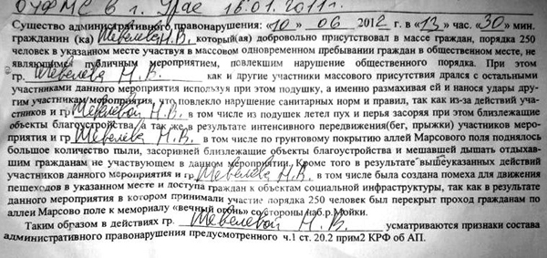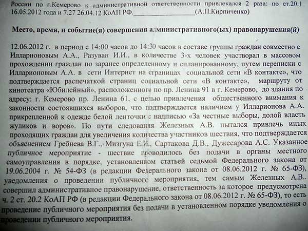 Все трое задержанных были оформлены как правонарушители по ст. 20.2 КоАП, белая лента с надписью "За честные выборы! Долой власть жуликов и воров!" изъята и направлена на экспертизу на предмет экстремизма. В интернет попал один из протоколов задержанного на этой акции студент Алексея Железных. Кстати, 14 июня он был вызван на допрос в областной центр по противодействию экстремизму.