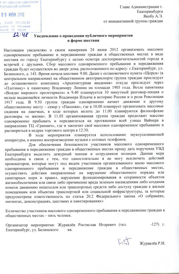 В ближайшее время в Екатеринбурге запланировано шествие с целью осмотра достопримечательностей города и встречи с друзьями" (24 июня с 9.50 до 12.30), а в Нижнем Новгороде - шествие "В магазин за батоном" (26 июня с 9.00 до 10.00). О результатах рассмотрения первого уведомления нам неизвестно, а вот на второе уже появился ответ органа власти.