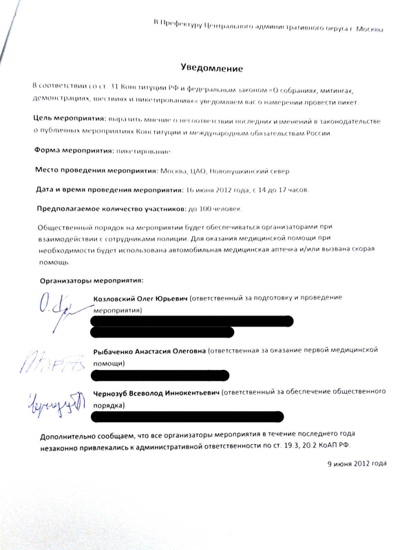 9 июня 2012 года члены федерального политсовета движения "Солидарность" Олег Козловский, Всеволод Чернозуб и лидер молодежной "Солидарности" Анастасия Рыбаченко подали в префектуру Центрального округа Москвы уведомление о проведении пикета против изменений в законодательстве о митингах. Мероприятие было запланировано на 16 июня на Пушкинской площади. В уведомлении организаторы отметили, что "в течение последнего года незаконно привлекались к административной ответственности по ст. 19.3, 20.2 КоАП РФ". Согласно новому закону, это лишает их права организовывать любые публичные мероприятия.