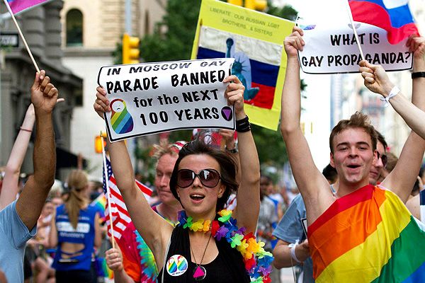 Текст: Вероника КомароваРусскоязычная американская ЛГБТ-группа (Rusa LGBT) выступила на ежегодном нью-йоркском гей-параде. Активисты под радужными флагами и антипутинскими плакатами прошлись по 5 авеню Нью-Йорка в знак протеста против гомофобии, нарушения прав человека, произвола власти и насилия против ЛГБТ-сообщества в современной России. На плакатах у протестующих были надписи: "Не езжайте в гомофобский Санкт-Петербург!", "Гей-парады запрещены, оппозиция в тюрьме. Назад в СССР, Путин??" и "В Москве гей-парады запрещены на 100 лет!".