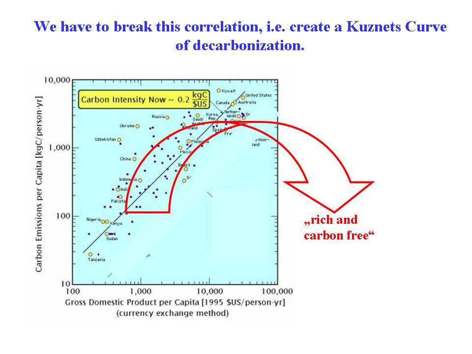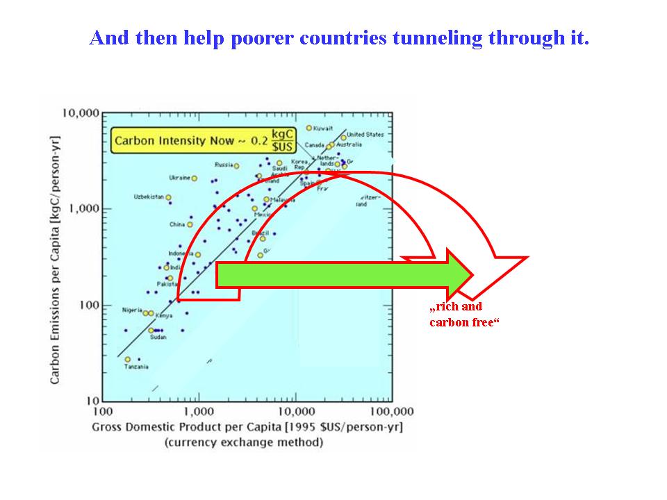 С ростом ВВП увеличивается выброс в атмосферу CO2, поэтому, на первый взгляд, сокращение выбросов CO2 ведет к уменьшению ВВП, а кому это нужно? Во-первых, мы должны построить кривую Кузнеца, стать богатой страной, не выбрасывающей в атмосферу углерод, но этого мало. Если все развивающиеся страны в верхней части кривой также внесут свой вклад, кроме того, мы должны будем помочь им, тогда шанс есть. Но никто не готов ехать в темный туннель, не зная, будет ли в конце туннеля свет. Поэтому мы должны продемонстрировать всему миру, что свет есть, тогда шанс будет.