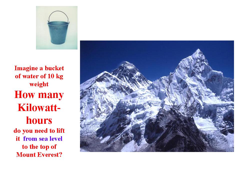 Если нам удастся это сделать, то окажется, что выгодно Камеруну, Эквадору, Индии стать очень высокоэнергоэффективными и начать использовать возобновляемые источники энергии. Высокоэффективные технологии будут быстро мигрировать на юг, потому что это выгодно. Кроме того, нам на севере больше не придется тратить миллиарды на гуманитарную помощь, потому что это сделает за нас гораздо более эффективно рынок. Не будут построены тысячи новых тепловых электростанций. Итак, возвращаюсь к технологии. Устранить привязку процветания к углекислому газу. Я задам вам вопрос из области физики: поднять груз в 10 кг на вершину горы Эверест – сколько будет затрачено киловатт-часов энергии, на ваш взгляд?
