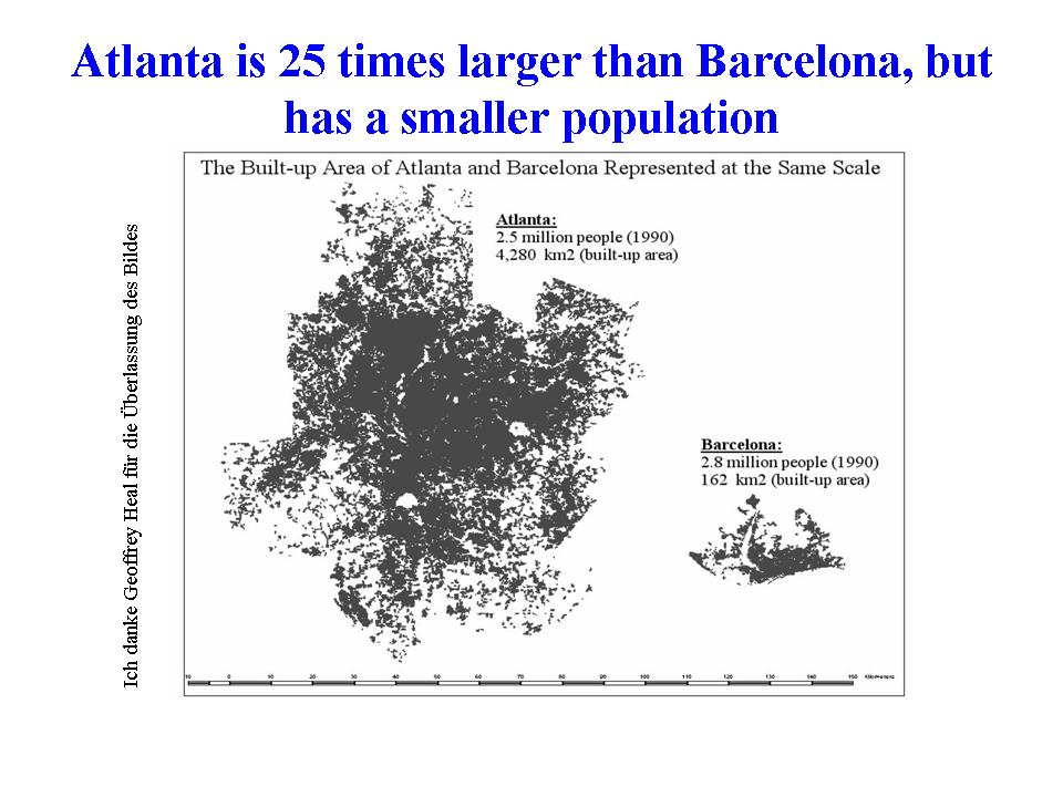 Это Атланта, город в 25 раз больше, чем Барселона. Где больше населения? В Барселоне. Атланта до абсурда распространилась, здесь практически невозможно построить метро или автобусные линии, потому что все живут изолированно друг от друга, это неразумно. Поэтому там очень высока цена на бензин.