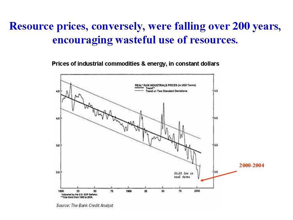 В течение этих двухсот лет ресурсы начали дешеветь, сейчас пришли китайцы на рынок, они потребляют огромное количество ресурсов - цены пошли вверх.