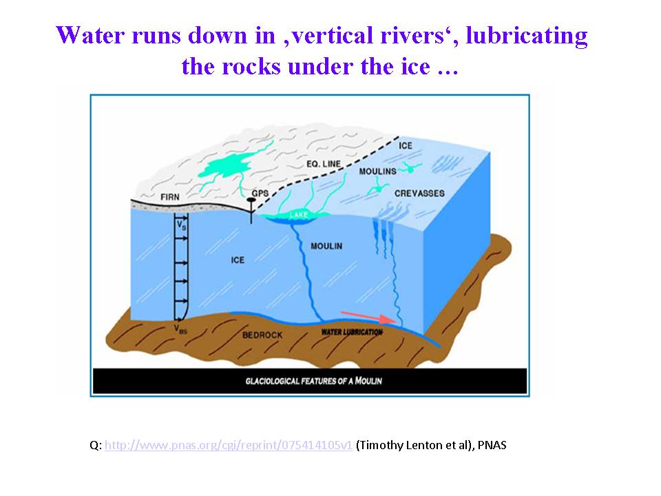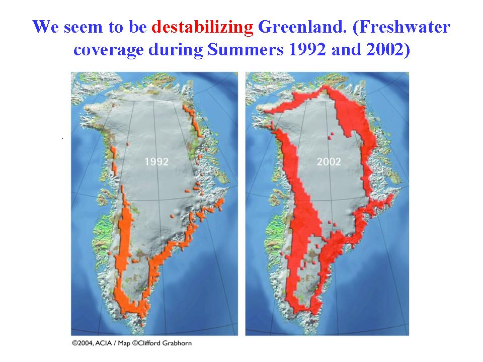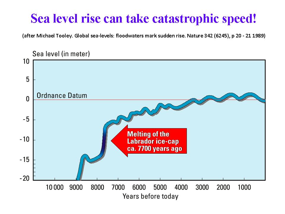 За 10-тилетний период поверхность, которую занимает пресная вода в Гренландии, увеличилась в четыре раза. Ужасающая динамика – летом пресная вода идет вниз через лед, проникает и смазывает подстилающую поверхность. Семь тысяч восемьсот лет назад то, что сейчас называется Лабрадором, на самом деле, было покрыт льдом. Это все распалось в течение короткого периода времени, раскололось, было унесено в океан. В результате уровень океана поднялся на 700 метров.