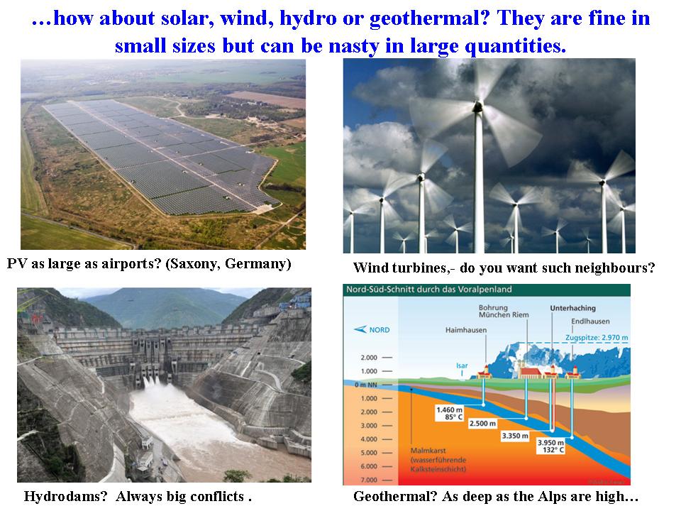 Гидроэлектростанции – многие усматривают социальные и экологические конфликтные ситуации. Геотермальные – вы бурите землю на глубину, равную высоте Альп, бросаете на ветер огромные средства, получая мало энергии. Конечно, мы должны увеличивать производство энергии из возобновляемых источников, но есть граница роста. Например, энергия ветра в прибрежных зонах моря или океана. Или использование биомассы, от сжигания отходов – можно, но есть ограничения.