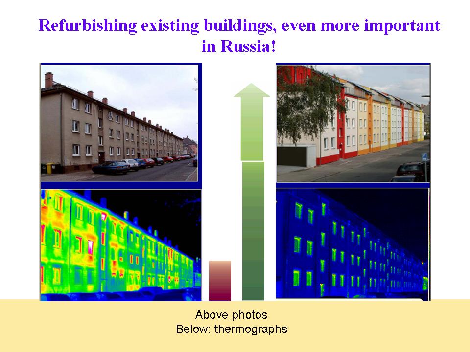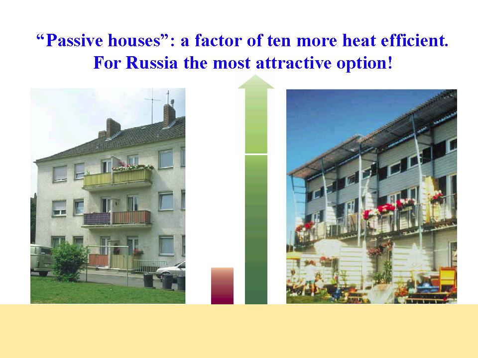 С помощью новой технологии строятся пассивные дома. Сегодня утром я встретился с архитектором, который работает приблизительно по такой же технологии. Это означает сокращение энергозатрат более чем в 10 раз. В таком пассивном доме воздух изумительно чистый, а платим мы буквально копейки за электроэнергию. Сокращение в 10 раз, потому что обычно около 40% электроэнергии уходит в воздух. Можно также модернизировать существующие здания – для Москвы это особенно актуально.