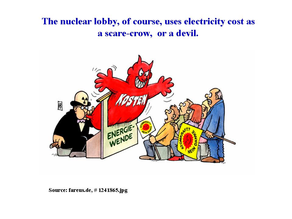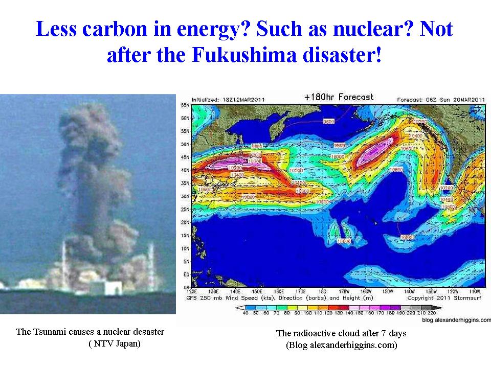 Нужно декарбонизировать нашу экономику. Что мы имеем в виду? Меньше CO2 в энергетическом секторе, меньше траты энергии на производство богатства, меньше богатства. Второе нежелательно, поэтому мы сосредоточим внимание на первом. 80% проблемы мы решим с помощью уменьшения выброса углерода энергетическим сектором. Есть люди, которые предлагают жечь уголь, улавливать CO2 и зарывать его в землю. Есть также возобновляемые источники энергии. И последнее - меньше энергозатрат на производство богатства. Давайте подробнее рассмотрим этот подход. Ядерная энергетика. Вы все помните катастрофу в Японии? Приблизительно 50 реакторов, и они сейчас не работают. Тем не менее, свет в Японии есть - за некоторыми исключениями. Поэтому 80% населения Японии говорят, что хотят постепенно избавиться от ядерной энергетики, она слишком опасна. Приблизительно такое же количество населения в России выступает за это.
