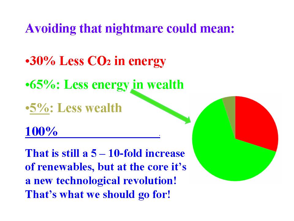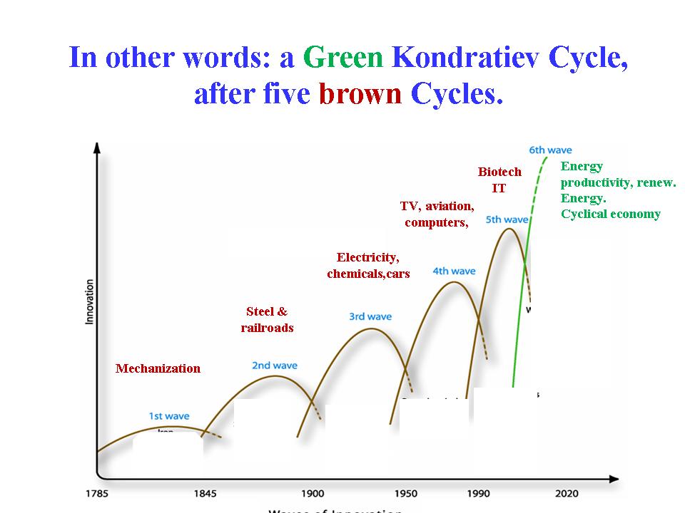 Давайте договоримся, что одна треть решения будет получена за счет возобновляемых источников энергии, а две трети – за счет уменьшения используемой энергии для производства дополнительного богатства. Это будет основная цель. На 5% меньше будет производиться богатства – это все равно выльется в увеличение производства от возобновляемых источников энергии в 5-10 раз, но фактически это будет технологическая революция. Сейчас такие циклы называются циклами Кондратьева, до этого их называли коричневыми циклами, которые ведут к уничтожению окружающей среды.