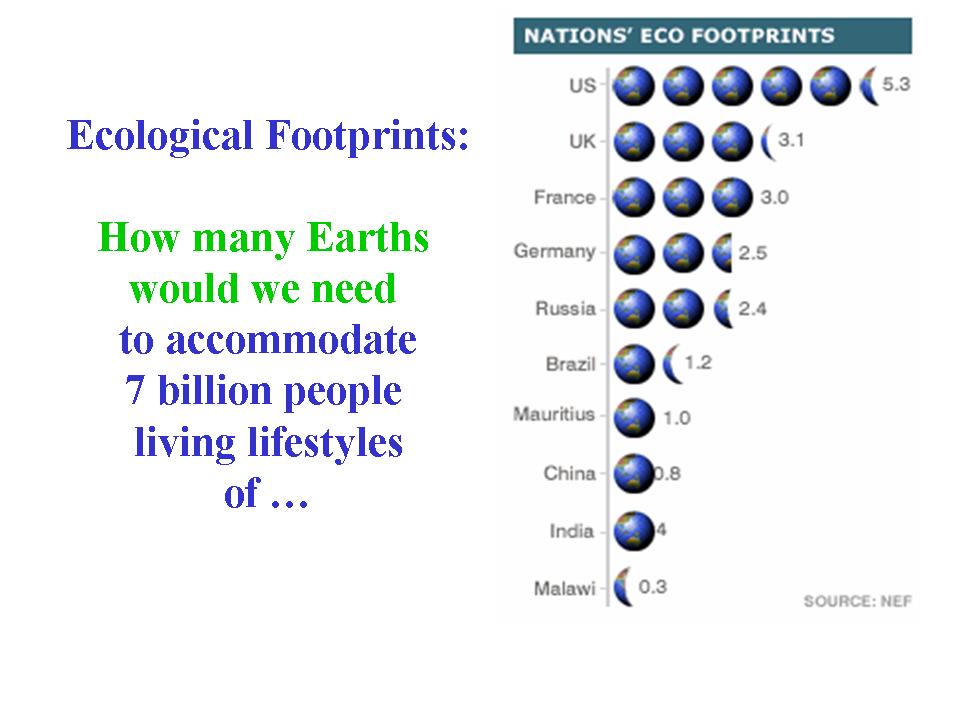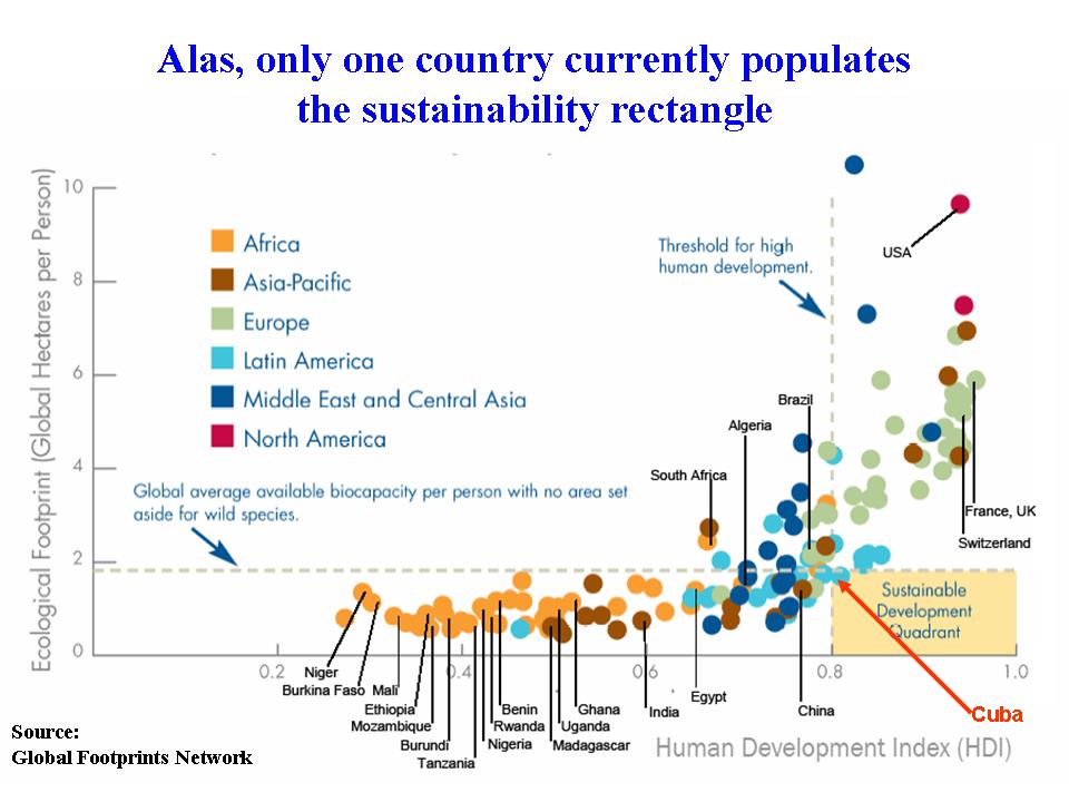 На этом графике показывается, что устойчивость достигается в прямоугольнике справа. Интересный вопрос вот в чем: сколько стран сегодня в мире находятся в этом прямоугольнике? Три? Хорошо. 4-5? Одна страна. Куба - по тем или иным странным причинам. Еще с советских времен они осознали, что очень важно образование и здравоохранение. Индекс человеческого развития имеет три основных компоненты: экономическое благосостояние, здравоохранение, уровень здоровья, образование. Кубинцам, хотя у них экономические условия не очень, удалось достичь достаточно высокого уровня здравоохранения, здоровья и образования. Но все западно-европейские страны имеют очень большой экологический след. В африканских странах очень низок индекс человеческого развития. В России след где-то порядка 4 гектара на душу населения, индекс человеческого развития чуть выше 0,8. Более устойчивый, чем США и Австралия, но менее, чем Куба. Вопрос: что же можно с этим сделать?