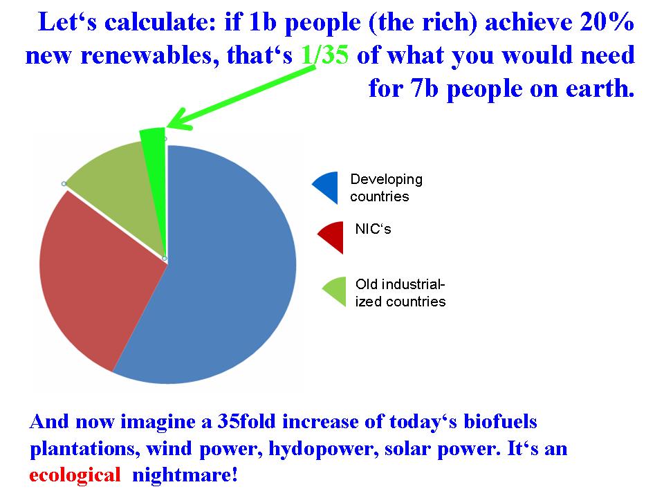 Давайте подсчитаем: если один миллиард более или менее богатых людей будут использовать 20% возобновляемой энергии, доля Франции в мире меньше, нам бы удалось выйти на 25%, допустим. Решит ли это глобальные проблемы? Это 1/5 от ста процентов, 1 миллиард – 1/7 от общего населения. Это 1/35 того, что нужно сделать. Представьте себе увеличение в 35 раз биоплантаций, гидроэнергетики, геотермальной и солнечной энергии, энергии ветра. Это будет просто экологическая катастрофа. Причем я говорю это после того, как упомянул, что я за возобновляемые источники энергии. Есть ограничения, повторяю. Для того чтобы избежать этой катастрофы, мы должны изменить нашу стратегию.