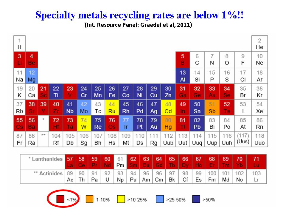 Была назначена группа экспертов по металлам. К собственному удивлению, посмотрев на то, как происходит утилизация металлов, они пришли к следующим результатам. Здесь таблица Менделеева. Все, что отмечено красным цветом, подвергается утилизации меньше, чем на 1%. Зеленые элементы требуются для автомобильных батареек. Мы все жалуемся, что китайцы нам не продают редкоземельные элементы, и они правы – зачем это делать, если мы их просто транжирим? Ситуацию можно улучшить, но для этого требуются лучшие технологии и мощности для извлечения металла и т.д.
