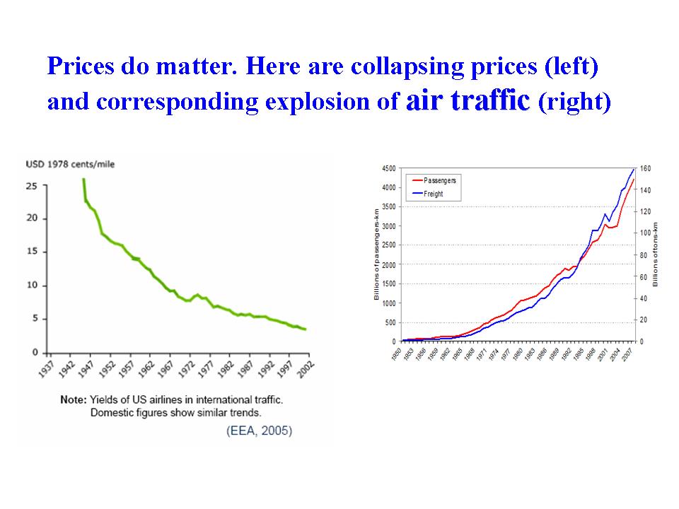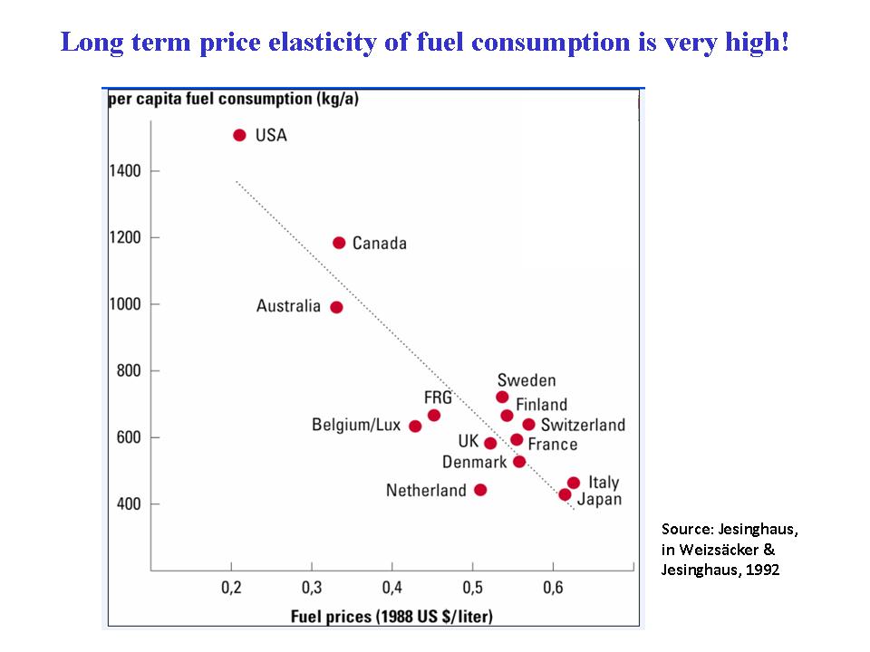 Следующий вопрос. Революция произойдет сама по себе. Если мы должны вмешаться, то каким образом? Это интересный вопрос. Я боюсь, что ничто не будет идти в правильном направлении, если все оставить рынкам. Потому что рынки говорят, что ресурсы абсолютно безграничны, но наше вмешательство не должно быть сверхбюрократичным. Я работал в биохимической отрасли, и, конечно, мне не могли нравиться эти тысячи правил. Может быть, тогда нам указывали что-то ценное. Конечно, ценообразование воспринимается неоднозначно. Мы не можем без ядерной энергетики, цены на ресурсы поднимутся вверх, но это не так. На самом деле, уровень цен имеет значение. Мы видим снижение цен, здесь показана ценовая реалистичность в отношении потребления автомобильного топлива в 80-е годы, после того, как в течение десятилетий в США проводилась политика удержания низких цен на бензин. В Японии и других странах была политика поддержания высоких цен. В Америке по сравнению с Италией и Японией цены отличались примерно в 4 раза.