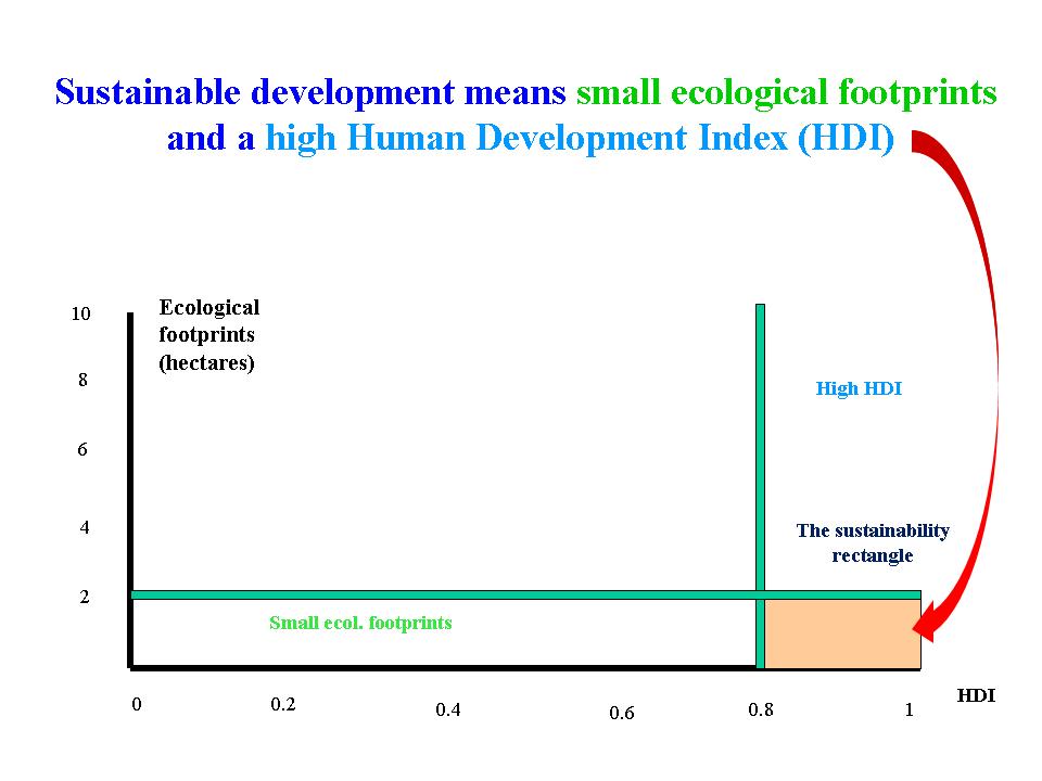 Есть такая сетка экологических следов. И вот сейчас, когда нас 7 миллиардов жителей на планете, максимальный средний след человека в среднем два гектара. Квартира, в которой живете, улицы, школы, университеты – пространство, которым вы пользуетесь. Если все это объединить, можно посчитать, сколько на вас расходуется пространства. Опять же, это все зависит от поведения человека. Если каждый уикенд вы летаете в Хабаровск, то ваш экологический след будет довольно большим. И мой экологический след, поскольку я часто летаю, очень большой. Устойчивое развитие требует того, чтобы этот экологический след был небольшим. Есть также социально-экономическое измерение устойчивого развития, поскольку все мы хотим жить хорошо. В ООН рассчитывается индекс человеческого развития: от нуля до единицы. И все, что между нулем и 0,8, – достаточно низкий уровень. 0,8 – некий порог, перейдя который, вы можете сказать, что живете хорошо.