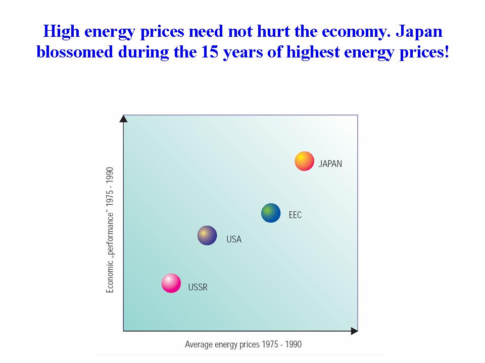 Еще один исторический пример. Когда был нефтяной кризис, японцы осознали, что они стали полностью зависимы от импорта энергоресурсов, и им это не понравилось. Они дали возможность ценам на энергоресурсы улететь вверх, и, конечно же, промышленность была недовольна. Правительство заключило соглашение с этими заводами, что они либо закроются, либо переедут в другое место, либо перейдут на менее энергоемкие процессы. И они это сделали. Более того, они разработали цифровые камеры, через два года после их изобретения эти камеры стоили больше, чем все заводы, вместе взятые. Или, например, керамика была всегда в Японии. Но в старомодном виде это горшочки и вазы, изоляция для высоковольтных линий электропередач. Они разработали высокотехнологичную керамику, через 10-15 лет весь мир стал заполнен японской керамикой. В экономическом плане это намного превосходило значимость алюминиевой промышленности. Японцы разработали суперпоезд, что тоже стало историей огромного успеха. Они разработали компьютеры пятого поколения. Через 15 лет периода, когда они держали высокие цены на электроэнергию, они стали самой трудоспособной страной мира.