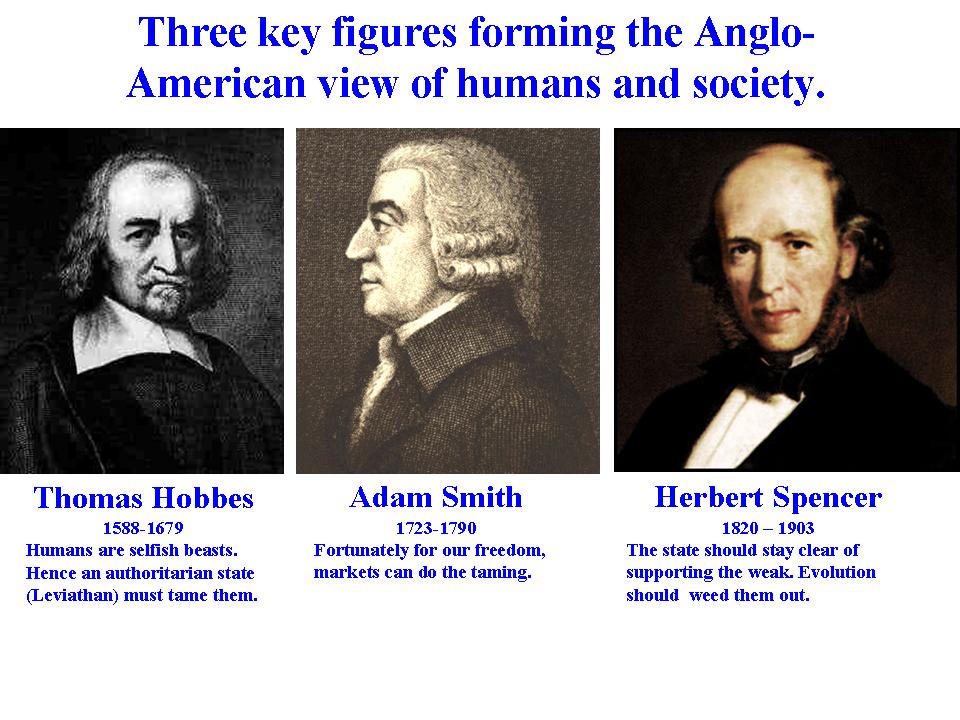 Что я имею в виду? потому что в сердцевине находится вера в рынки. Это галерея деятелей, которые создали американский взгляд на общество, начиная с Томаса Гоббса, который сказал, что по своей природе человек – это эгоистический зверь, и нужен диктатор, чтобы этих зверей приручить. Потом через 200 лет Адам Смит сказал, что диктатор не нужен, потому что это приручение могут сделать рынки. Но он жил в то время, когда совершенно естественным образом радиус действия рынков и государства был тем же самым. У рынков не было возможности не выполнять законы. И Адам Смит, конечно, мог верить в существование баланса. Потом Герберт Спенсер, друг Чарльза Дарвина, предложил концепцию социал-дарвинизма. Есть история, связанная с ним. Он был в США и видел, что эмигранты умирали сотнями и тысячами, потому что не было соцобеспечения. Он воскликнул: «Мы привилегированные наблюдатели того, как расцветает революция».