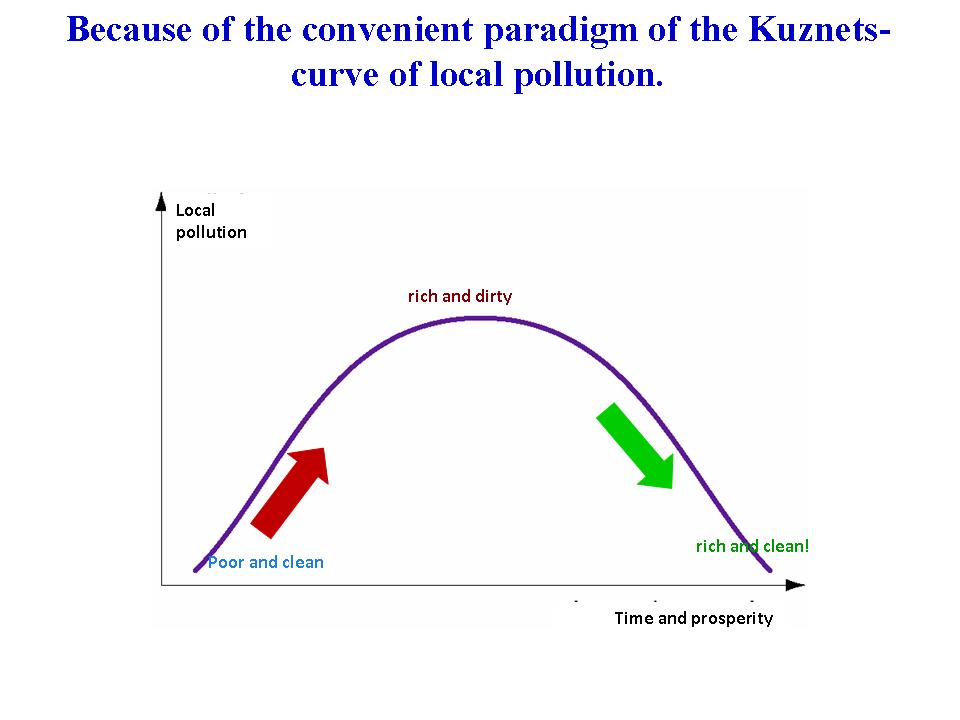Обычно страны начинают свое развитие, когда они бедные и экологически чистые. Так было в России. Потом начинается индустриализация, они становятся богатыми и экологически грязными. В конечном итоге они становятся настолько богатыми, что могут себе позволить затратные меры по охране экологии.