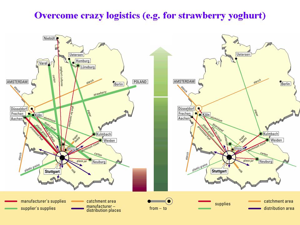 Например, ситуация с производством йогурта с клубникой – это огромная сеть транспортных перевозок в Германии. Можно получить йогурт такого же качества, но с меньшими транспортными затратами. Мы предлагаем перейти от интенсивной горной добычи к цикличной экономике.