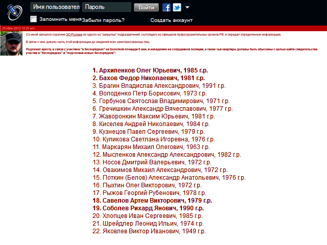 По словам Басманова, данные люди "подлежат аресту, в связи с участием "в беспорядках" на Болотной площади 6 мая, и нападению на сотрудников полиции, а также чьи квартиры должны быть обысканы с целью найти свидетельства участия в "беспорядках" и "подготовки новых беспорядков". Он поясняет, что список ему передал "соратник ЭО "Русские"" из одного из "закрытых" подразделений, состоящего из офицеров правоохранительных органов РФ".