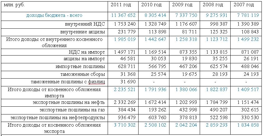 Как видно из данных, приведенных в этой таблице, доходы от косвенного обложения внешнеторговых операций в два-три раза превышают косвенные доходы от обложения внутренних операций. В 2007 году обложение внешнеторговых операций составило 37% доходов бюджета, а в 2008 году – уже 50%. И эта структура поступлений не замедлила сказаться в кризисном 2009 году, когда бюджет сразу потерял 1,2 трлн. доходов из-за падения объемов внешней торговли, и не смог компенсировать их за счет роста внутреннего обложения. В следующих, 2010 и 2011 годах эти доходы восстановились и даже превысили докризисный уровень, но рост, как мы видим, оказался не очень долговечным. И для федерального бюджета это чревато большими неприятностями.