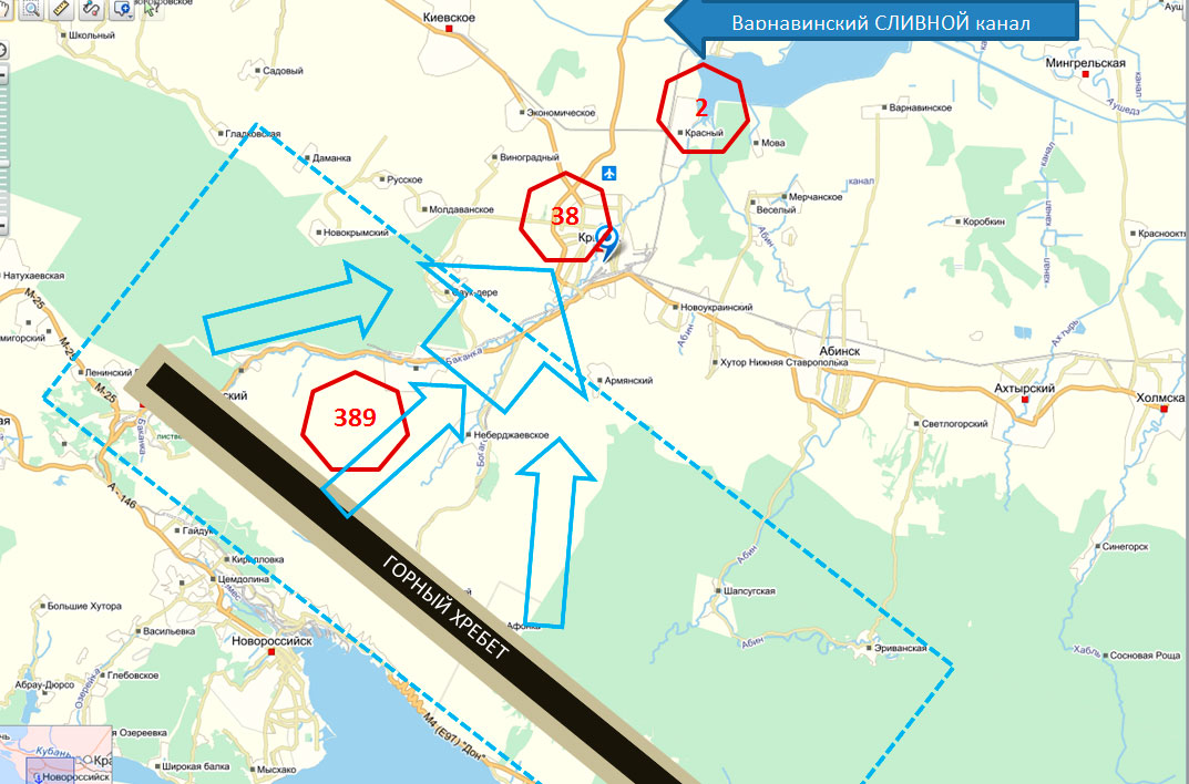 Как известно, вода течет СВЕРХУ вниз, а не наоборот. Закон земного притяжения никто не отменял. И что мы видим на карте? Крымск находится ВЫШЕ, чем водохранилище, следовательно вода из водохранилища не могла хлынуть на Крымск, как утверждает, например, Олег Митволь. Более того, у водохранилища есть СЛИВНОЙ канал, который в полном соответствии с рельефом местности направлен в другую сторону от Крымска — это Варнавинский сливной канал. Избыток воды должен был бы пойти по нему, а не на Крымск.
