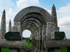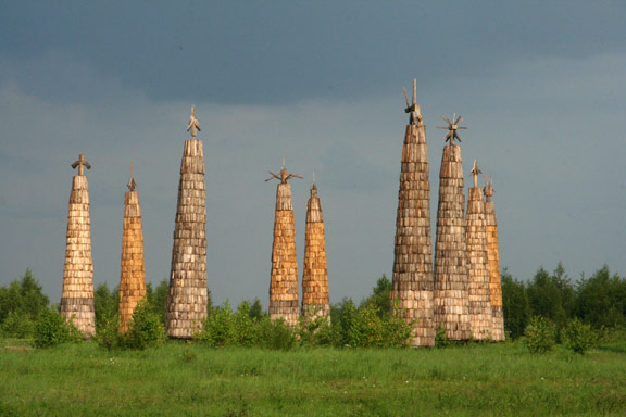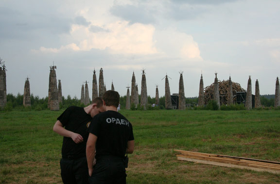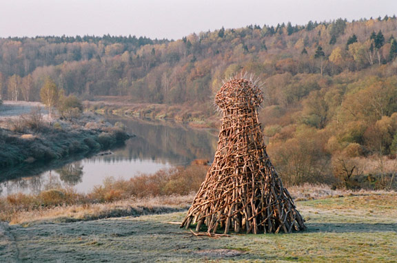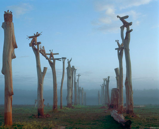 Юноша посреди поля звонит по мобильному своей подруге, и говорит: «Я стою у границ империи». Это не джедай из «Звездных войн», просто парень приехал в деревню Никола-Ленивец посмотреть новую работу Николая Полисского «Вселенский разум». А «Границы империи» - работа 2007 года, два ряда оголенных деревьев-столбов, на которых сидят двухглавые орлы. Удивительно удачно Полисскому удалось связать западную традицию лэнд-арта с русской географией и порожденными ей особенностями сознания.
