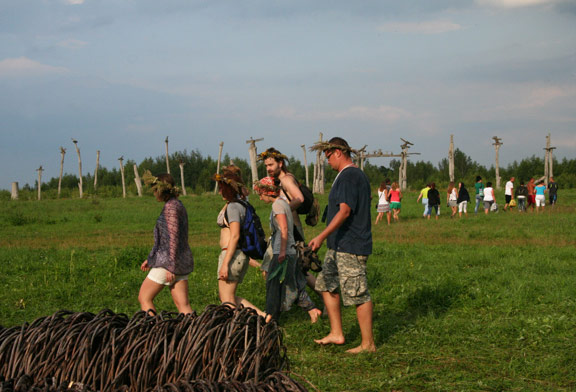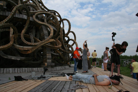С каждым годом на фестивали в Никола-Ленивец приезжает все больше зрителей В этот раз на Ивана-Купалу люди, следуя древнерусскому обычаю, украшали голову венкамиНо как только построят под Москвой что-нибудь обычное развлекательное, многие уйдут туда, и в Никола-Ленивце все сбалансируется, останутся те, кто интересуется именно современным искусством, а также ландшафтным дизайном и архитектурой – с 2006-го раз в два года проводится фестиваль «Архстояние». Он похож на «никола-ленивецкие промыслы» тем, что проекты не строят «навечно», они в большинстве случаев временные и подлежат разборке или естественному руинированию. Но в отличие от проекта, который с помощью художественной деятельности реорганизовал жизнь деревенских жителей, включил в арт-процесс аборигенов, на «Архстоянии» работы делают приглашенные профессионалы, архитекторы и художники.