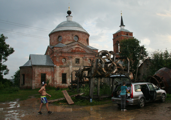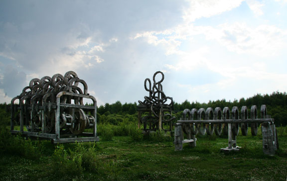 Вид от "Вселенского разума" на аллею ракет. Николай Полисский рассказывает о том, как делали проект.А за извилистой сферой в кустах расположены конструкции, напоминающие промышленные станки, тоже из бруса. Если аллея из конусов с антеннами – органы чувств, то это – органы исполнительные. Но дерево уже стало серым от старости, стоят они в густой траве и становится понятно, что эти «станки» ничего не производят. Это напрямую связывает проект в Никола-Ленивце с впечатлениями, полученными по дороге из Москвы. В буйной зелени вдоль дороги то и дело видны заброшенные заводы и сельскохозяйственные комплексы. Они почти всегда красивы своей функциональностью, как и любая индустриальная архитектура, но и печально красивы - как руины. Некоторые заводы отреставрированы и приспособлены под торговые центры, и хотя они и сияют ухоженностью, все равно рождается чувство меланхолии. Мы перестали производить, деятельная жизнь отмирает и остается потребление.