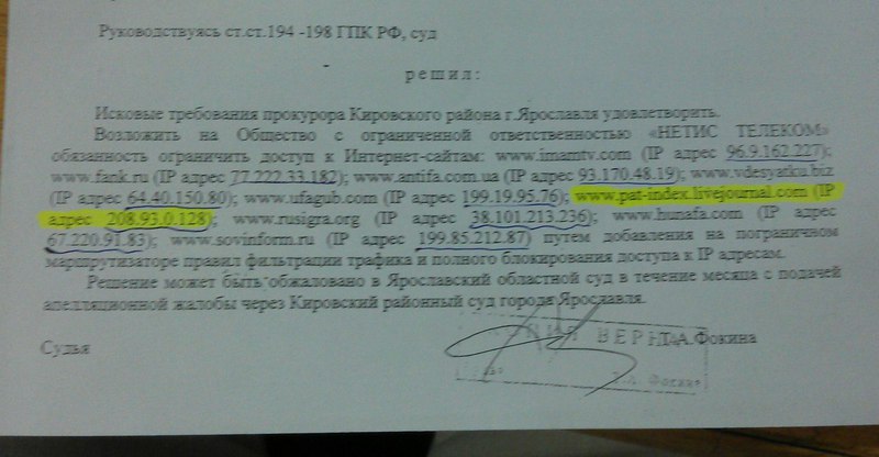 В судебном решении речь идет о конкретном блоге, содержание которого кировская прокуратура посчитала экстремистским. Однако оказалось, что IP-адрес блога совпадает с IP-адресом всего ЖЖ. Суд разбираться не стал — и теперь несколько тысяч ярославских пользователей не могут зайти на "запрещенный" интернет-ресурс. "Нетис Телеком" уже объявил о том, что будет подавать кассационную жалобу в облсуд, потому что считает решение незаконным.
