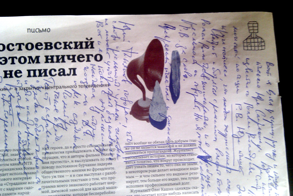 Вот я попросил у официантки ручку и пишу эту телегу для Юры Сапрыкина на полях его колонки в «Большом городе» от 11 июля, найденном в том же заведении.
