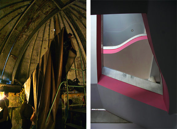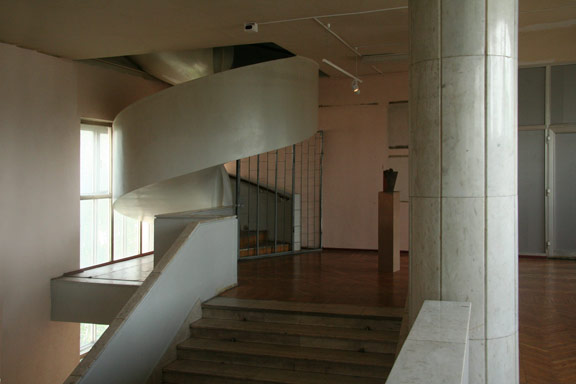 Бетонная винтовая лестница к обсерватории, под ней - работа Анны Титовой. Тут же наверху – еще одна работа Титовой. Диагонально поставленная оконная рама посреди широкой лестничной площадки. Она не отделяет, как обычно, улицу от помещения или зал от зала, но указывает на то, что внутри Дворца существуют два пространства. Изначальное, конструктивистское, с поверхностями из крашеного бетона, где красота возникает из целесообразности, и наслоения последующих реконструкций. Васильев трогает деревянные перила и говорит: «Раньше они были металлические, и кстати, намного удобнее». Диаметр бетонных колонн был равен ширине балок, лежащих на них, но после того, как их обшили мрамором, колонны нелепо выступают за края балок. Позднейшие представления о красивом вообще здесь выглядят несуразно и жалко, в том числе и темно-розовый цвет, которым директор кафе «Маэстро» выкрасил стены, а глянцевый подвесной потолок, съевший всего лишь 10 сантиметров высоты, сразу создал давящее ощущение.