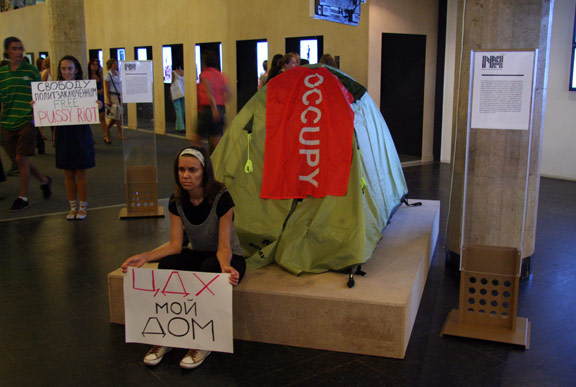 Еще одна работа Жиляева в рамках основного проекта в ЦДХ, проект «Культурная единица», заставляет усомниться в том, что за подобной деятельностью стоит желание достичь каких-либо общественных изменений. Справа в фойе на подиуме, как музейный экспонат, стоит палатка с надписью «Оккупай». Рядом сидит девушка с табличкой «Free Pussi Riot», и еще одна стоит с картонкой «ЦДХ – наш дом». Девушка наверху, внутри выставки – «Я не хочу быть культурной единицей, я хочу быть культурным множеством». Лица девушек выкрашены пятнами какой-то серо-серебряной краски.