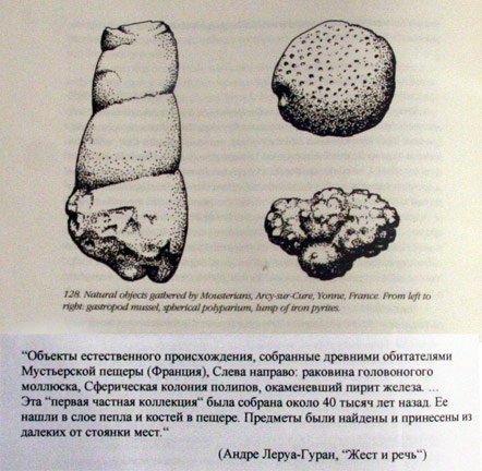 На витрине с визуальными комментариями - первая частная коллекция в книге Андре Леруа-Гурана "Жест и речь" Вторая витрина - кураторский комментарий Стаса Шурипы. Среди материалов есть разворот из книги Андре Леруа-Гурана «Доисторические охотники-собиратели» - фотография мирной семьи из горного Вьетнама и рисунок того, что останется от них археологам в случае какого-нибудь неожиданного катаклизма. На схеме «после катастрофы» - скелеты людей и домашних животных, стоявших рядом на фото. «Единственное указание на жизнь, которую они прожили, единственный уцелевший объект – это серебряное ожерелье на шее ребенка. И если бы кости со временем были поглощены землей, как это чаще всего случается, вся жизнь этой крестьянской семьи была бы сведена к единственному ожерелью» - пишет Леруа-Гуран. Культура – и есть свидетельство того, что мы жили, без нее наше существование не подтверждается.
