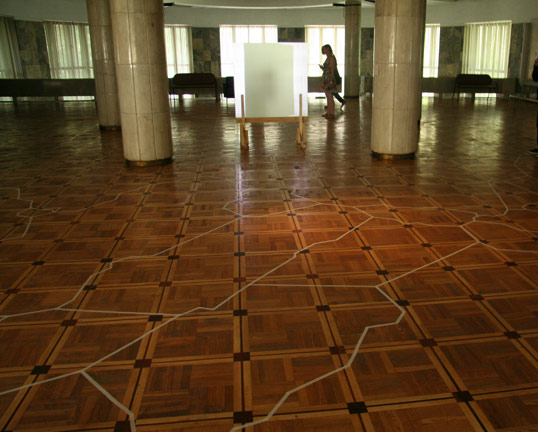 Работы Дмитрия Филлипова: "Ты здесь" - на полу, между колоннами - "Подозрение". Не только конструктивисткие мотивы увлекают художников. В танцевальном зале полы выложены позднесоветским узорным паркетом, который систематизирует зал, позволяя мысленно нарезать пространство на те или иные части по линиям паркета. Танцы очень связаны с соблюдением и нарушением дистанции, как и паркетная доска – какой-то танец служит для самовыражения, и ему нужно как можно больше места, другой – лишь повод проигнорировать приличия и, нарушив интимное пространство, прикоснуться к партнеру. Дмитрий Филлипов выклеивает белой лентой криволинейную хаотичную сетку, которая делит пространство на живые зоны. Паркет визуализирует модульность интерьера, эти линии – существование невидимых, разных для каждого воздушных оболочек вокруг тела, которые негласно считаются приватными и ненарушимыми, с разными нормативами в разных культурах и социальных прослойках.