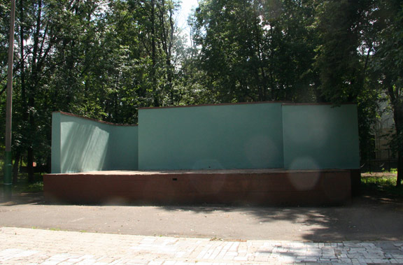 Ольга Зовская "Структура 2" Где заканчивается искусство и начинается обыденность? Пожалуй, искусство, единожды начавшись в сознании зрителя, уже не заканчивается никогда. На заднем дворе стоит летняя эстрада, тоже спроектированная Весниными – очень скромная, просто сочетание криволинейных и прямых стен, сценическое пространство, плавно перетекающее в закулисное. Стены выкрашены в нежный зеленый цвет. Зрители, выходящие на улицу, чтобы досмотреть продолжение экспозиции, начинают фотографироваться на этой сцене, и прохождение через нее становится художественным впечатлением, похожим на работы знаменитого художника Джеймса Тарелла, который превращает комнаты в пространство, залитое чистым цветом и светом, где не остается привычных координат.