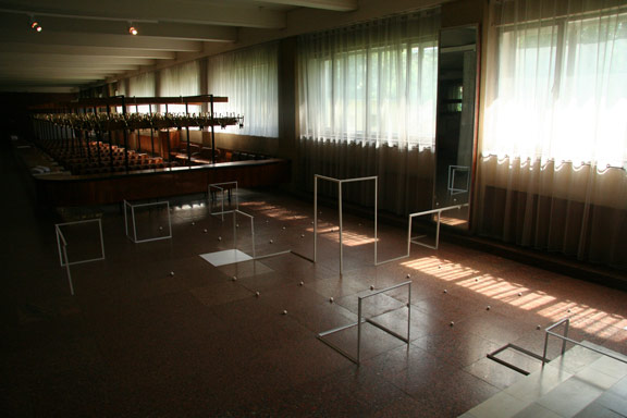 Произведения, разбросанные по территории здания, невелики по размеру, особенно в сравнении с огромными масштабами постройки. В описаниях работ даже встречается термин «микрособытие» - в нем есть что-то из детства, когда найденная на земле палочка может стать ключом ко вселенной. И тут нечто похожее, но по-взрослому – объекты художников настраивают на восприятие самого здания, а через него - и времени больших перемен, когда оно было задумано. И выставка становится огромной, включая в себя здание.