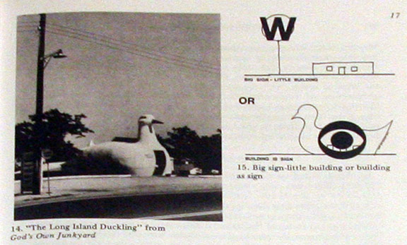 На витрине с визуальными комментариями: книга Роберта Вентури "Учиться у Лас-Вегаса": "Лонг-Айлендский утенок: маленький дом внутри большой вывески или здание как вывеска?"