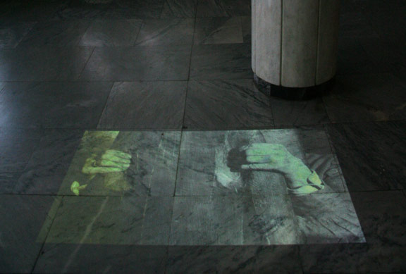 Его же работа "Подозрение" – экран, на который проектор светит яркой сеткой прямоугольных линий. Иногда она целиком занимает всю плоскость, иногда почему-то фрагментируется, иногда вовсе гаснет, как будто проектор перестал работать. Экран можно обойти, чего в кинотеатре не сделаешь. Там становятся понятны причины изменения изображения – между световым лучом и экраном висит квадратный лист железа, который, поворачиваясь в воздухе, оказывается то параллельным экрану и «гасит» свет, то оказывается повернут к нему перпендикулярно, и тень от его тонкой грани становится незаметной. Высказывание о том, как сложно понять истинные причины видимого.