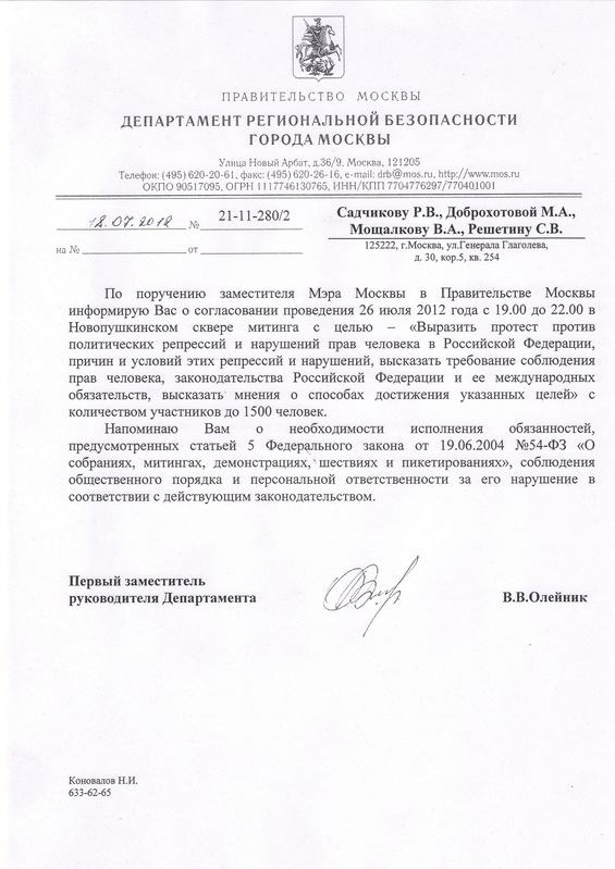 Акция в поддержку «узников Болотной» 26 июля согласована (ДОКУМЕНТ)