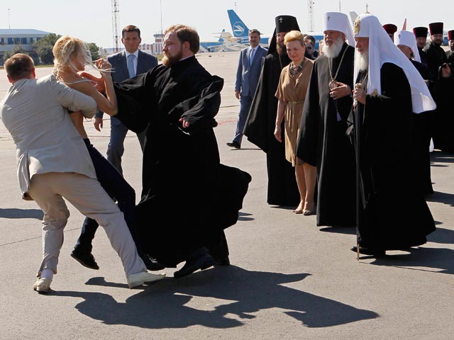 Напомним, что инцидент с участием активистки группы Femen случился во время подхода патриарха к журналистам на взлетной полосе в аэропорту "Борисполь". К предстоятелю РПЦ, выкрикивая "Изыди вон!", подбежала полуобнаженная девушка. В метре от патриарха ее остановили глава патриаршей пресс-службы Александр Волков и сотрудник службы безопасности.