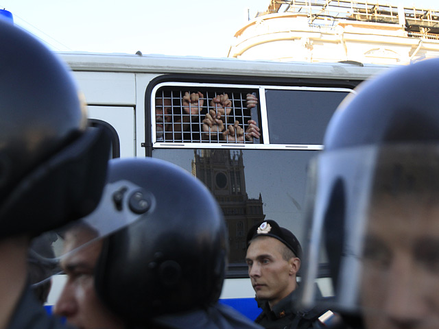 Задержанные 31 июля в Москве на несогласованной акции "Стратегии-31" гражданские активисты Геннадий Строганов и Алексей Никитин приговорены к 12 и 10 суткам ареста соответственно. Судья Сергей Комлев судил их по статье 19.3 КоАП РФ за неповиновение полицейским, хотя на самом деле оппозиционеров задержали и судили за поджог портрета Владимира Путина (ФОТО из блога фотографа Виталия Рагулина). Портрет почему-то не попал в протоколы административного правонарушения, сообщается на сайте незарегистрированной партии "Другая Россия".