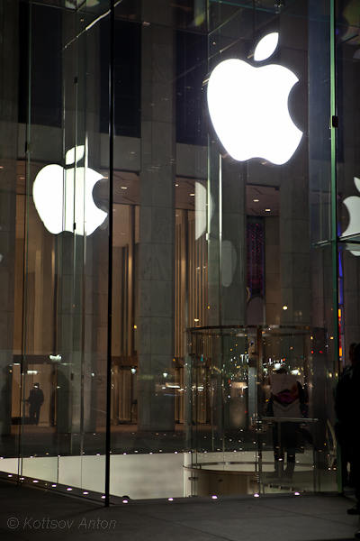 Уже совсем в ночи мы пошли в покупать продукцию фирмы "Эппл". Магазины Apple действительно оформлены с фантазией — это довольно приличных размеров стеклянный куб с логотипом, светящееся яблоко видно издалека.