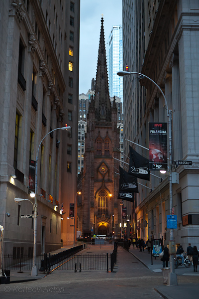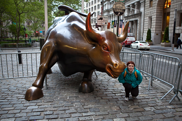 Уже практически в темноте пошли по Уолл-Стрит в поисках Фондовой биржи, знаменитого быка и рекомендованной путеводителем церкви Троицы. На быка наткнулись совершенно случайно!